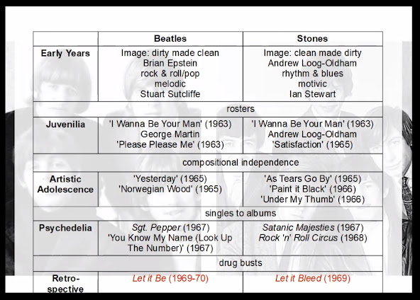 Hubo un análisis de las dos formaciones en cuanto a los roles de los músicos en cada grupo. Mientras que en los Stones el vocalista principal era Mick Jagger, en los Beatles dicha labor recaía en John y Paul, y ademas tenían espacio para George y Ringo. Los roles de la primera guitarra y bajo estaban plenamente demarcados y los Stones contaban con Brian Jones para cualquier otro instrumento.